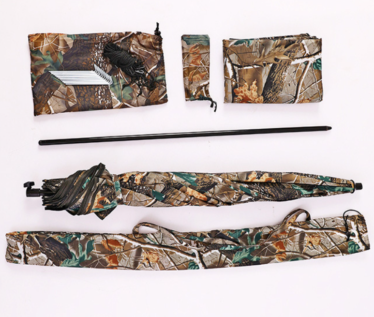 Parasol ze sztycą, dopinany na zamek materiał tworzący boki, sztyce przedłużającą, odciągi do kotwienia w podłożu, szpilki mocujące, pokrowiec na namiot.